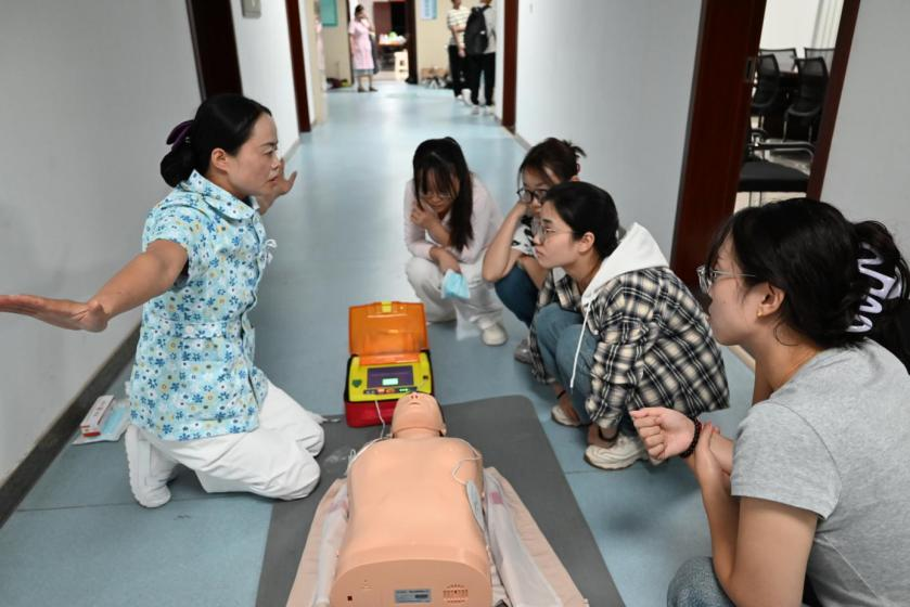 培訓(xùn)以“技能操作”為核心內(nèi)容,涵蓋心搏驟?,F(xiàn)場(chǎng)對(duì)成人進(jìn)行心肺復(fù)蘇和使用自動(dòng)體外除顫器(AED)、氣道異物梗阻現(xiàn)場(chǎng)應(yīng)用海姆立克急救法救助病患,以及緊急傷口包扎等實(shí)操技能的演示教學(xué)。