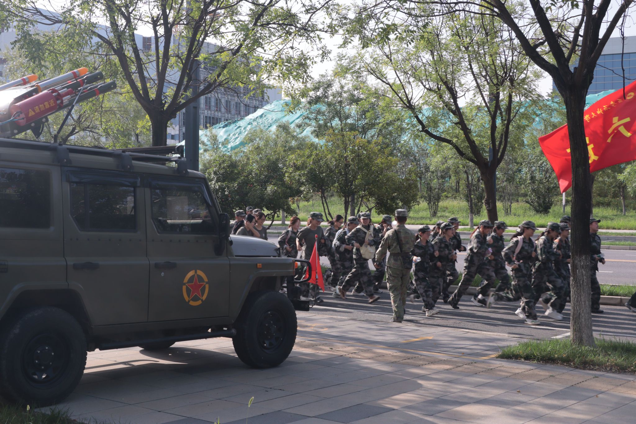 7:50,全體新生在東區(qū)操場集結(jié)完畢,按一營、二營、三營、四營的順序,以連為單位成四路縱隊(duì)依次出發(fā),拉練路線以東區(qū)操場為起點(diǎn),經(jīng)學(xué)校東門出、北門進(jìn),沿途設(shè)置4個(gè)調(diào)整點(diǎn)。各連隊(duì)間隔保持20-30米,行軍速度控制在3公里/小時(shí)。上午11:30,全體新生順利返回東區(qū)操場。