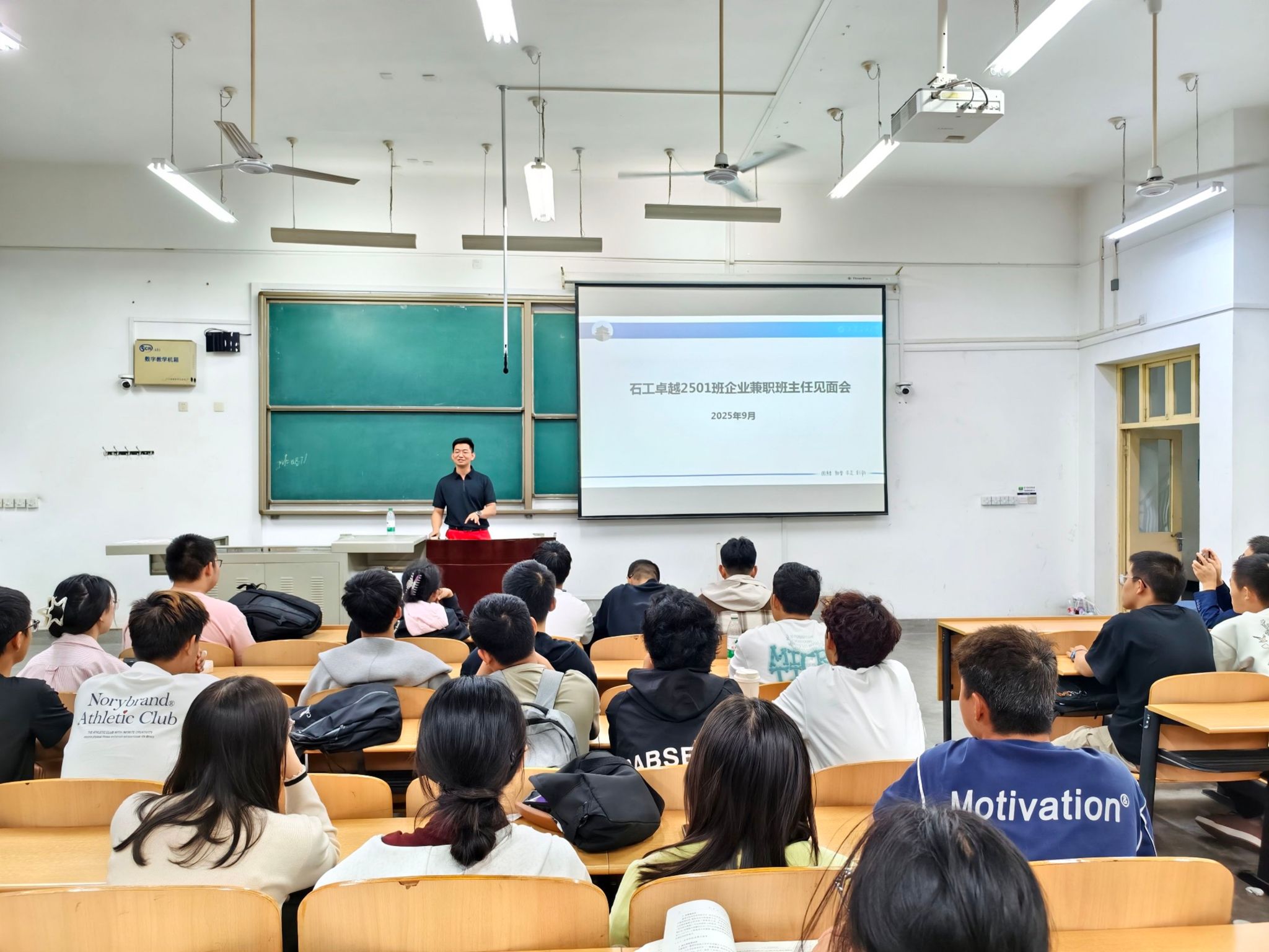 在博思樓208教室,陳建國組織召開了石工(卓越)2501班首次線下班會,他勉勵同學(xué)們要傳承發(fā)揚石油精神、鐵人精神,樹立“為祖國獻(xiàn)石油”的遠(yuǎn)大理想,在服務(wù)行業(yè)發(fā)展中實現(xiàn)人生價值。