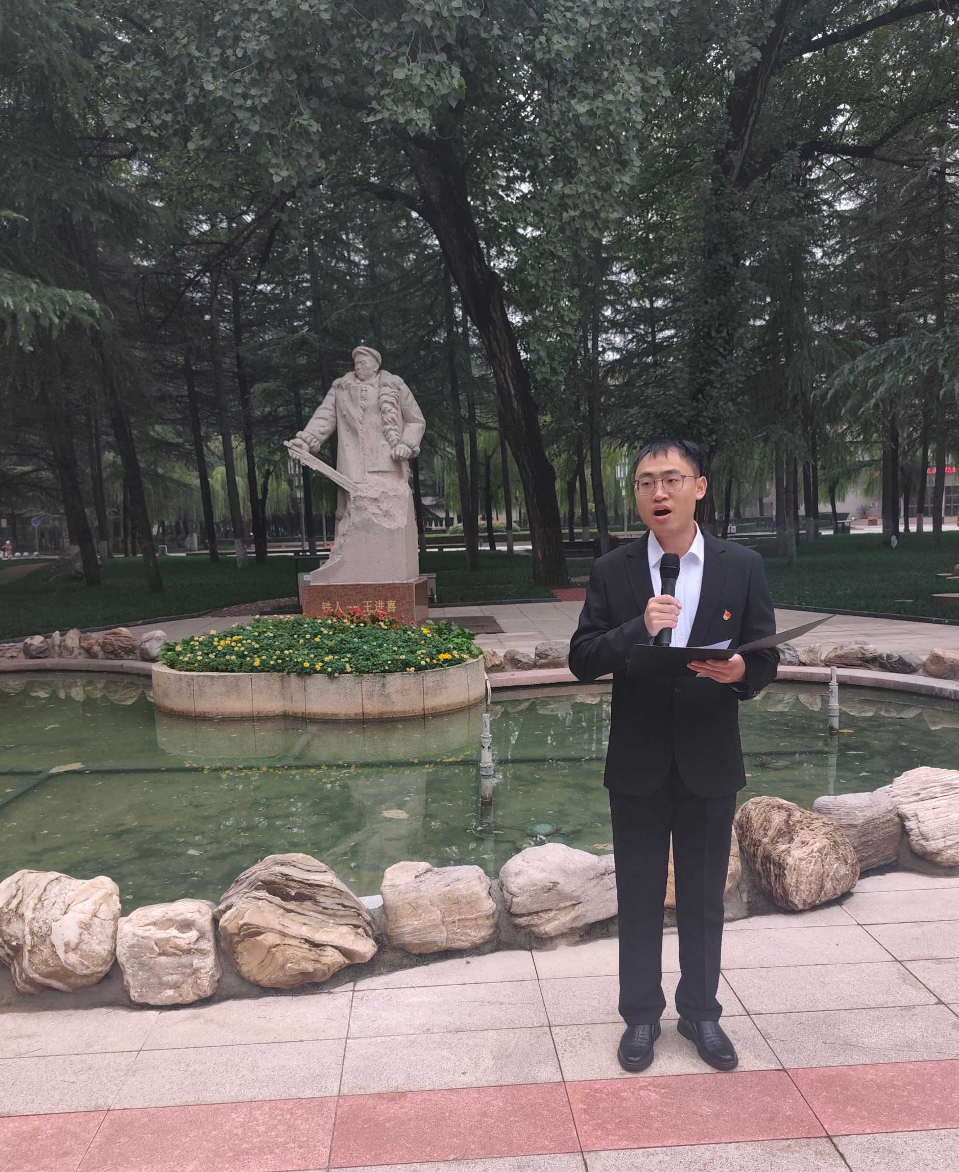 活動(dòng)伊始,全體人員肅立奏唱《我為祖國(guó)獻(xiàn)石油》。歌聲落定,全體人員在鐵人王進(jìn)喜雕像前,研究生黨員代表羅開(kāi)慶帶領(lǐng)大家重溫鐵人奮斗歷程。從祁連山麓的放牛娃,到玉門油田的鉆井工人,再到帶領(lǐng)‘豆腐隊(duì)’蛻變?yōu)椤撹F隊(duì)’的鉆井闖將,鐵人王進(jìn)喜用二十年光陰書寫了石油人的奇跡答卷。羅開(kāi)慶號(hào)召同學(xué)們以鐵人精神為指引,在工作和學(xué)習(xí)中弘揚(yáng)鐵人堅(jiān)韌不拔的拼搏精神、發(fā)揚(yáng)鐵人無(wú)私忘我的奉獻(xiàn)精神、學(xué)習(xí)鐵人不斷引領(lǐng)創(chuàng)新進(jìn)取的精神,把“為國(guó)找油、為國(guó)獻(xiàn)油”的初心融入學(xué)術(shù)科研和社會(huì)服務(wù)的全過(guò)程,為國(guó)家能源事業(yè)高質(zhì)量發(fā)展貢獻(xiàn)青年力量。