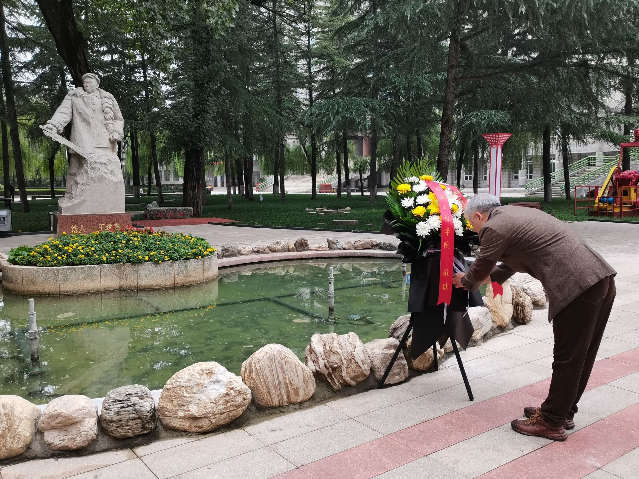 隨后,黨委書記司馬文龍向鐵人雕像深深鞠躬,并為鐵人雕像敬獻(xiàn)花籃、整理花籃緞帶。