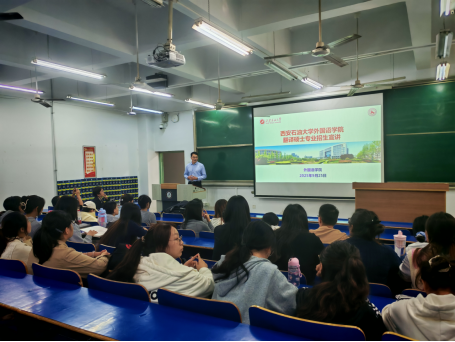 宣講過程中,團(tuán)隊重點闡述我校MTI專業(yè)的人才培養(yǎng)目標(biāo)——緊密對接能源領(lǐng)域國際化發(fā)展、區(qū)域經(jīng)濟(jì)社會發(fā)展需求,培養(yǎng)具備國際視野、創(chuàng)新思維與思辨能力的高層次、應(yīng)用型、專業(yè)化筆譯人才。鄧林詳細(xì)介紹了三大特色研究方向的培養(yǎng)重點,同時展示了專業(yè)的硬件支撐實力,包括計算機輔助翻譯實驗室、人工智能翻譯平臺及在線智能翻譯管理平臺的建設(shè)與應(yīng)用情況,讓學(xué)子直觀感受專業(yè)的技術(shù)賦能優(yōu)勢。陳柯深入介紹了學(xué)位點的師資力量以及學(xué)位點“石油石化”特色課程體系內(nèi)容,我校MTI課程主動適應(yīng)數(shù)字智能時代發(fā)展趨勢,堅持翻譯技術(shù)賦能,注重學(xué)生跨學(xué)科知識儲備與綜合能力的培養(yǎng),力求通過系統(tǒng)化培育,切實提升學(xué)生的專業(yè)競爭力與實踐應(yīng)用能力。最后,鄧林就2026年我校MTI碩士研究生招生計劃、近年報考人數(shù)變化及錄取分?jǐn)?shù)線等關(guān)鍵信息進(jìn)行詳細(xì)說明,為有意向報考的學(xué)子提供精準(zhǔn)參考。