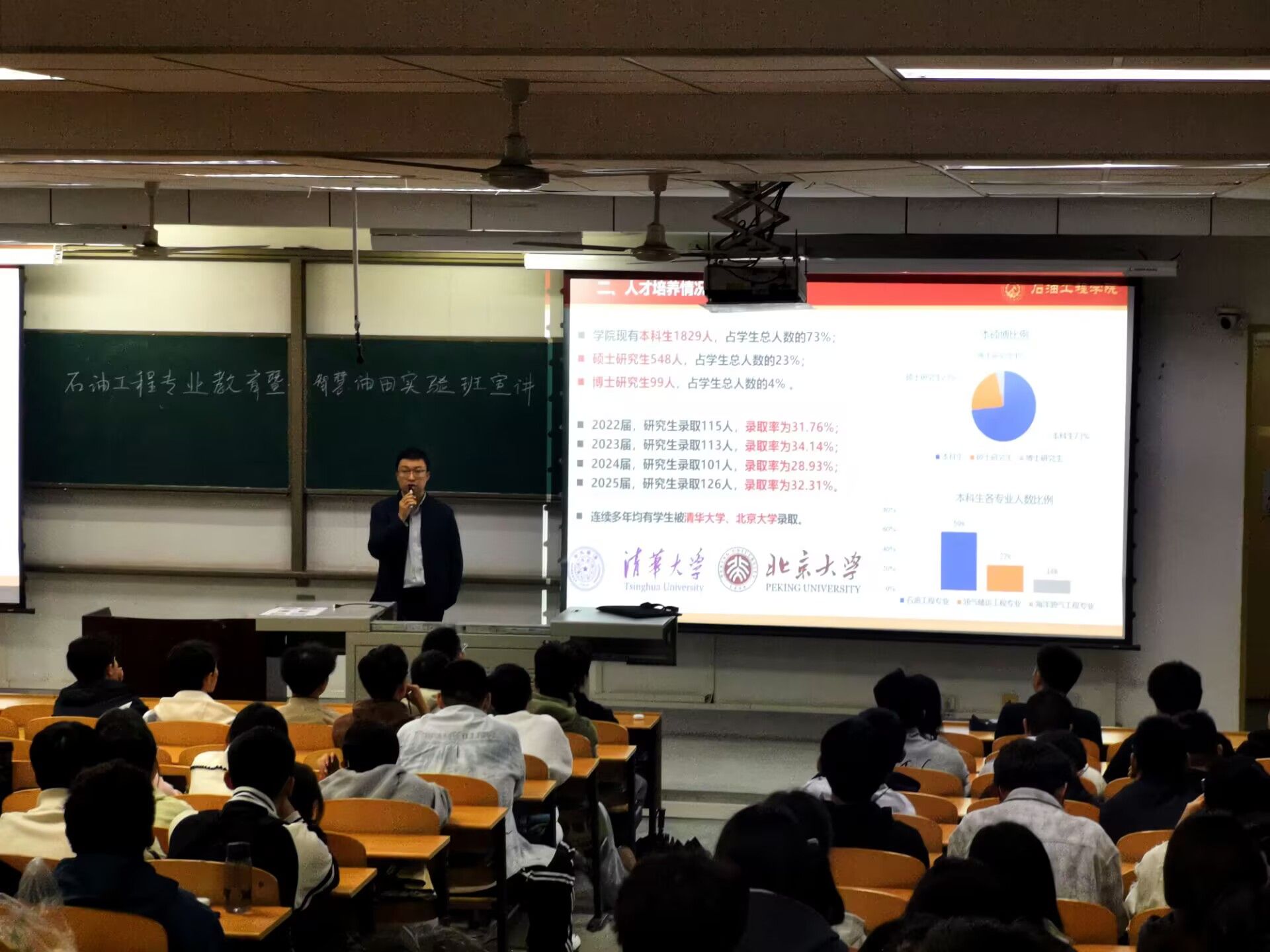 10月11日下午,王琛在博覽樓A139為石工卓越2501、2502班和石工2501—2506學(xué)生開展專業(yè)教育。他詳細(xì)介紹了學(xué)院整體情況,人才培養(yǎng)情況和教學(xué)改革創(chuàng)新方面的基本情況。重點(diǎn)圍繞學(xué)院近年來在教學(xué)改革方面的舉措,包括設(shè)立“智慧油田實(shí)驗(yàn)班”,以“油氣工程+人工智能”為特色,通過小班化、前沿性教學(xué)模式,培養(yǎng)兼具工程實(shí)踐能力和創(chuàng)新思維的高層次人才。他鼓勵學(xué)生充分利用學(xué)院資源,積極參與學(xué)科競賽和科研項(xiàng)目,提升國際化視野與跨學(xué)科能力