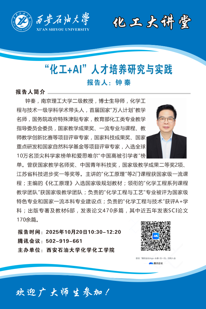 為深入探索人工智能時代化工專業(yè)與課程建設(shè)的新路徑與新方法,10月20日上午,化學化工學院“化工大講堂”特邀南京理工大學二級教授、國家級教學名師鐘秦教授,通過騰訊會議線上開展題為“化工+AI人才培養(yǎng)研究與實踐”的專題報告。報告會由化學化工學院黨委書記孫會珠主持,化學化工學院學院師生代表近60人參加了報告會。