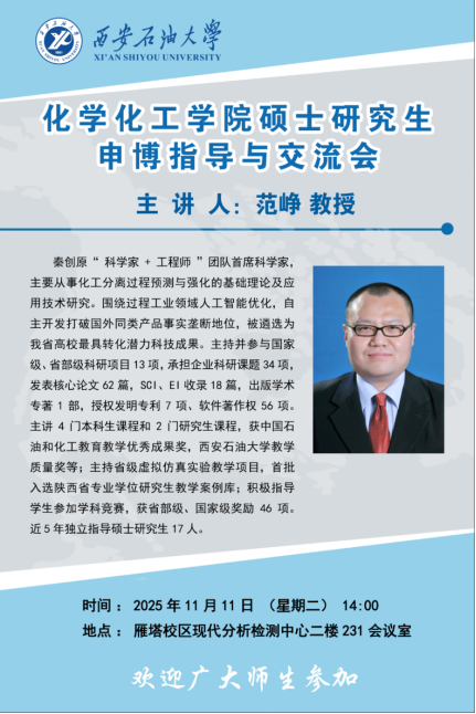 為幫助有申博意向的碩士畢業(yè)生明確發(fā)展方向、掌握申請技巧,11月11日下午,化學化工學院在雁塔校區(qū)學院會議室召開2026屆碩士畢業(yè)生申博指導(dǎo)與交流會。學院副院長范崢、黨委副書記喬曉、研究生輔導(dǎo)員曹勃全體有申博意向的2026屆碩士畢業(yè)生參會,會議由黨委副書記喬曉主持。