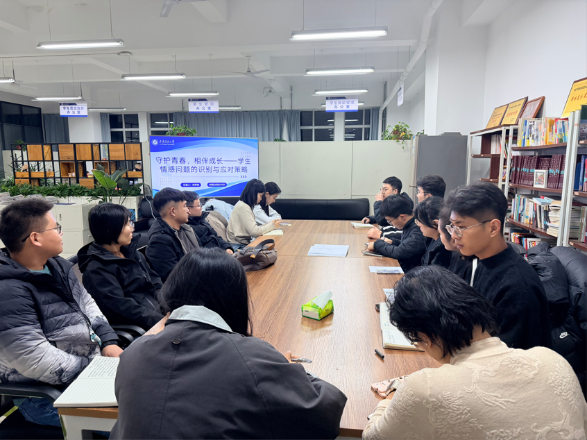 為進(jìn)一步提升輔導(dǎo)員隊(duì)伍的專業(yè)素養(yǎng)與工作能力,更好地守護(hù)學(xué)生健康成長(zhǎng),2025年11月21日晚19:30,學(xué)生工作部于鄠邑校區(qū)開(kāi)物樓117舉辦了以“守護(hù)青春,相伴成長(zhǎng)——學(xué)生情感問(wèn)題的識(shí)別與應(yīng)對(duì)策略”為主題的輔導(dǎo)員交流研討沙龍。本次沙龍邀請(qǐng)地球科學(xué)與工程學(xué)院輔導(dǎo)員劉學(xué)斌擔(dān)任主講人,活動(dòng)由學(xué)生工作部學(xué)生心理成長(zhǎng)指導(dǎo)中心主任焦文潔主持,學(xué)生工作部副部長(zhǎng)畢軼慧及院(系)輔導(dǎo)員代表參會(huì)。