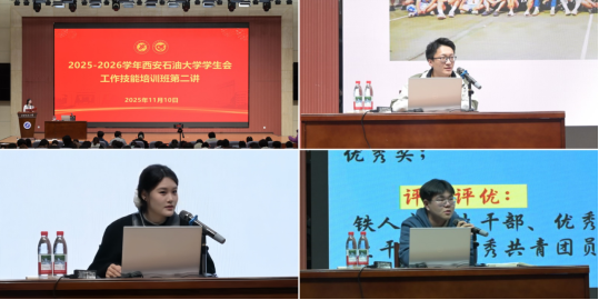 11月10日晚,培訓(xùn)第二講由校院兩級(jí)優(yōu)秀學(xué)生干部代表在弘石學(xué)術(shù)報(bào)告廳作工作經(jīng)驗(yàn)分享。研究生會(huì)執(zhí)行主席張振陸以“同研會(huì)逐光,赴成長(zhǎng)遠(yuǎn)方”為題,從研會(huì)總體概況、部門特色活動(dòng)、個(gè)人成長(zhǎng)三個(gè)方面向同學(xué)們分享工作技能;校學(xué)生會(huì)主席團(tuán)成員虞茗荃以“學(xué)生干部核心素養(yǎng)和文體活動(dòng)籌備”為題,展開活動(dòng)籌備的技能傳授,助力學(xué)生會(huì)新成員掌握協(xié)調(diào)溝通、活動(dòng)策劃等核心技能;石油工程學(xué)院學(xué)生會(huì)執(zhí)行主席梁國(guó)璽以“工作開展與籌辦”為題,從活動(dòng)類型分析、活動(dòng)流程總結(jié)、活動(dòng)宣傳推廣三個(gè)方面分享經(jīng)驗(yàn),助力學(xué)生會(huì)成員提升工作能力。