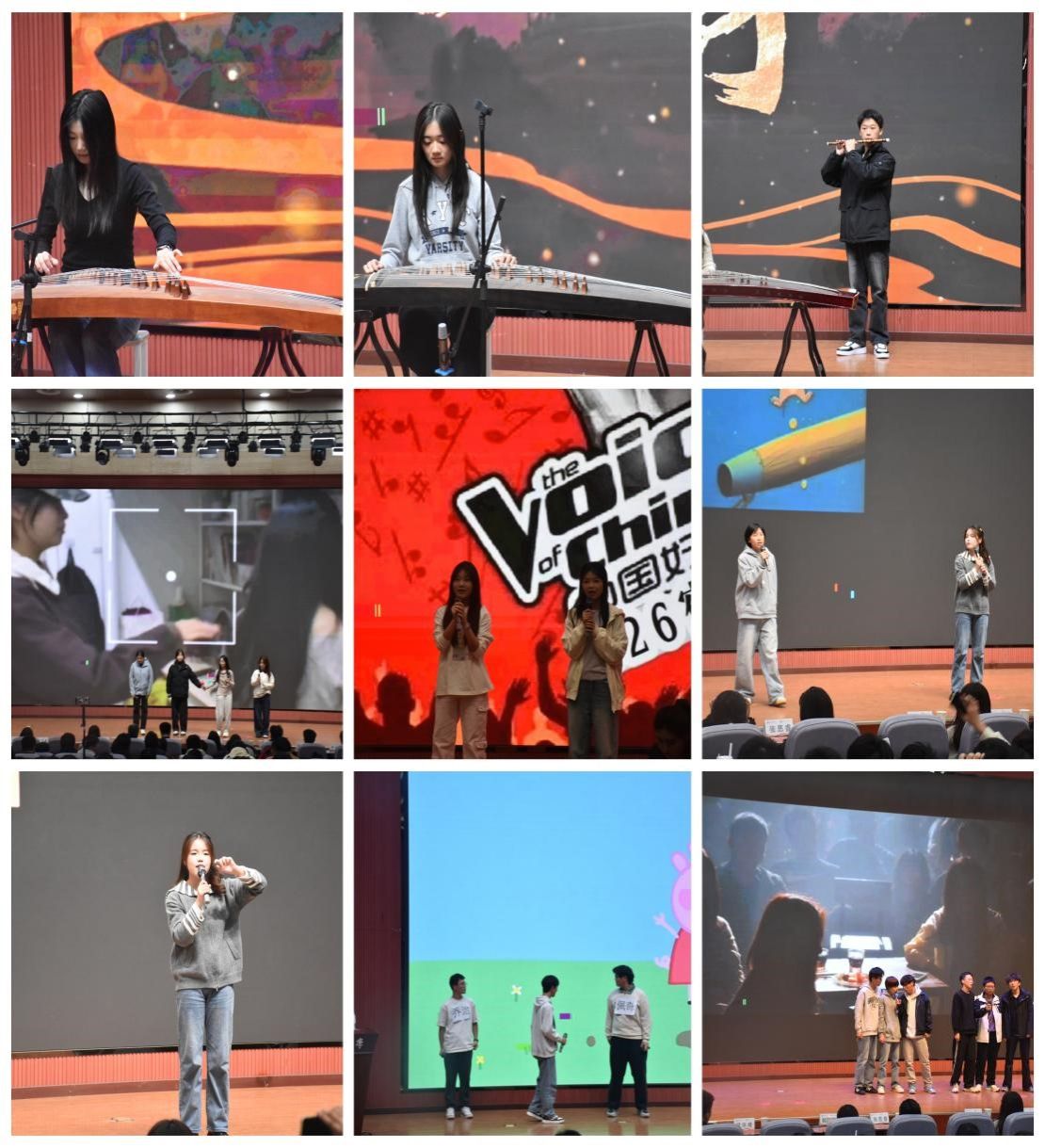 表彰環(huán)節(jié)結(jié)束后,獲獎宿舍分別展示了各自的豐碩成果。民樂合奏《象王行》先聲奪人,氛圍瞬間點燃;五個宿舍依次登臺展示了各具特色的舍徽設(shè)計歷程,從理念構(gòu)思到視覺成型,每一處細節(jié)都凝聚著同學們的巧思與團隊智慧;手抄報作品《雅室生輝》,通過圖文并茂的形式,生動詮釋了宿舍文化的內(nèi)涵,彰顯出深厚的情感寄托與人文意趣;宿舍成員合唱《一笑傾城》、《愛錯》、《成都》,以歌聲傳遞出室友間的溫情與默契;宿舍主題演講《屋檐下的星光》《致635的我們》,真摯表達了同學們對宿舍生活的深厚情感與美好期盼;舞臺劇《宿舍好聲音》、英語表演《Muddy Puddles》及微電影《629“甄嬛傳”之曠課風波》,則憑借生動演繹與巧妙創(chuàng)意,將現(xiàn)場氣氛推向高潮,笑聲掌聲不絕。