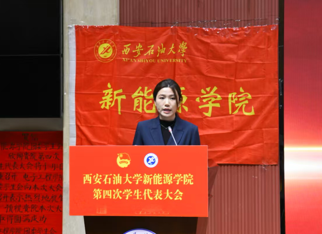 12月8日,西安石油大學(xué)新能源學(xué)院第四次學(xué)生代表大會在邑校區(qū)弘石報告廳隆重召開。校團(tuán)委副書記王軍策,新能源學(xué)院黨委書記顏庭星、黨委副書記袁家寶出席會議,校學(xué)生會及兄弟學(xué)院學(xué)生會代表受邀參會,學(xué)院各年級團(tuán)總支書記與全體學(xué)生代表齊聚一堂,共商學(xué)院學(xué)生工作發(fā)展大計。