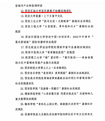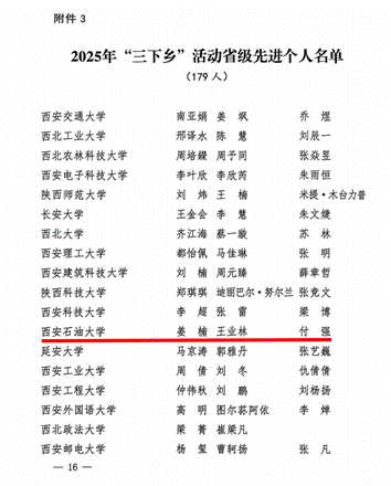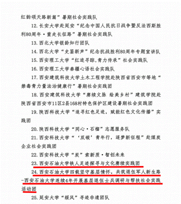 近日,共青團(tuán)陜西省委、中共陜西省委教育工委在全省范圍內(nèi)組織開展的2025年陜西省大學(xué)生暑期文化科技衛(wèi)生“三下鄉(xiāng)”社會實踐活動評選表彰結(jié)果揭曉,我校電子工程學(xué)院堅定禁毒不松懈實踐團(tuán)隊被評為省級標(biāo)兵團(tuán)隊,石油工程學(xué)院鐵人足跡探尋與文化賡續(xù)實踐團(tuán)、機(jī)械工程學(xué)院四載堅守基層情懷,共筑退伍軍人新生路—西安石油大學(xué)連續(xù)4年開展基層退伍士兵調(diào)研與幫扶社會實踐活動團(tuán)被評為省級優(yōu)秀團(tuán)隊,姜楠、王業(yè)林、付強(qiáng)被評為省級先進(jìn)個人,馬克思主義學(xué)院《童心向黨憶崢嶸薪火相傳愛國情暑假社會實踐團(tuán)不同階段學(xué)生群體的抗戰(zhàn)精神教育調(diào)研報告》被評為省級優(yōu)秀調(diào)研報告,并獲團(tuán)省委專項資助。