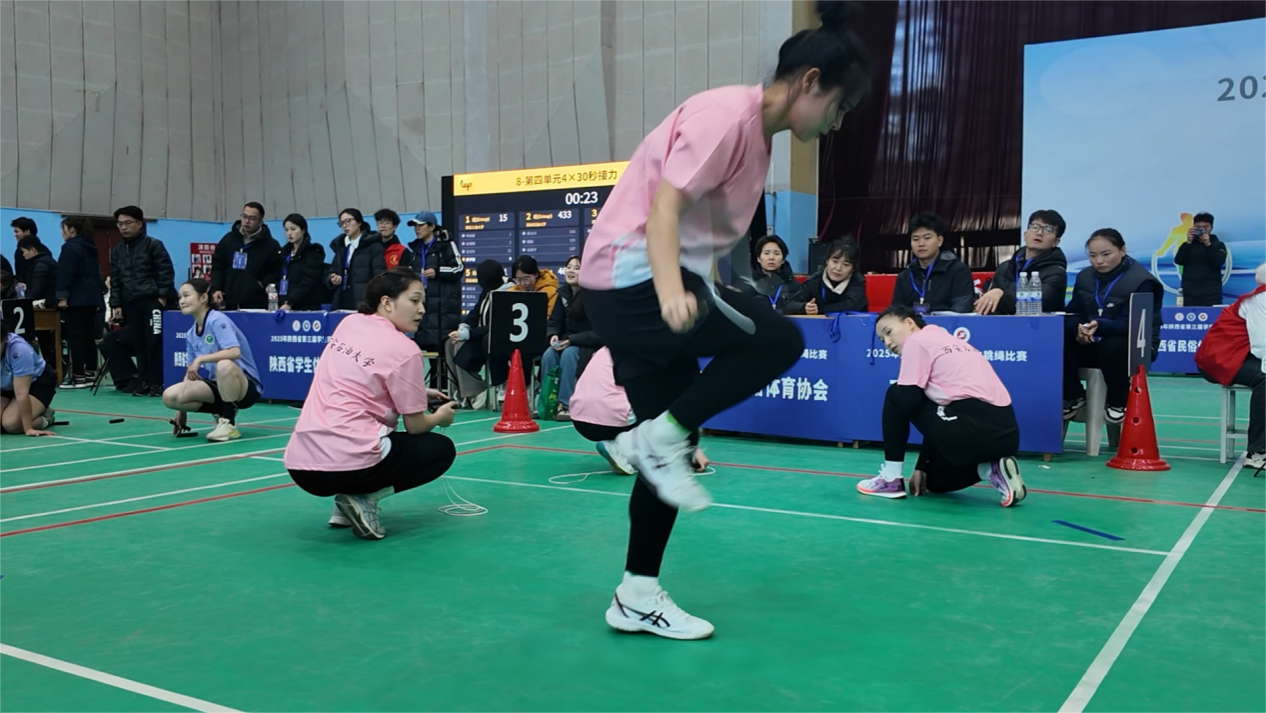 本次賽成功舉辦,依賴于嚴(yán)謹(jǐn)周密的組織保障團(tuán)隊(duì)。主辦方嚴(yán)格遴選裁判團(tuán)隊(duì),賽前經(jīng)系統(tǒng)培訓(xùn)與考核認(rèn)證,執(zhí)裁時(shí)目光如炬、計(jì)錄精審,更于間歇反復(fù)磋商尺度,以專業(yè)與公信捍衛(wèi)賽事天平。志愿者團(tuán)隊(duì)盡職盡責(zé),從引導(dǎo)疏通、物資整備到流程銜接無不悉心安排,他們是賽場內(nèi)外最溫情的紐帶。醫(yī)療團(tuán)隊(duì)全程駐守,專業(yè)醫(yī)護(hù)與急救物資齊備,為選手安全完賽提供無聲而堅(jiān)實(shí)的守護(hù)。西安石油大學(xué)傾力支持,提供一流的場館設(shè)施,更在安保、后勤等方面全面護(hù)航,為這場盛會(huì)奠定了最可靠的運(yùn)行基座。我校體育學(xué)院徐小仙老師說:“學(xué)校高度重視本屆賽事的組織與服務(wù),體育學(xué)院始終致力于搭建高水準(zhǔn)體育平臺(tái),將跳繩納入大學(xué)體育課程,推動(dòng)這項(xiàng)運(yùn)動(dòng)在校園中的普及與發(fā)展。”