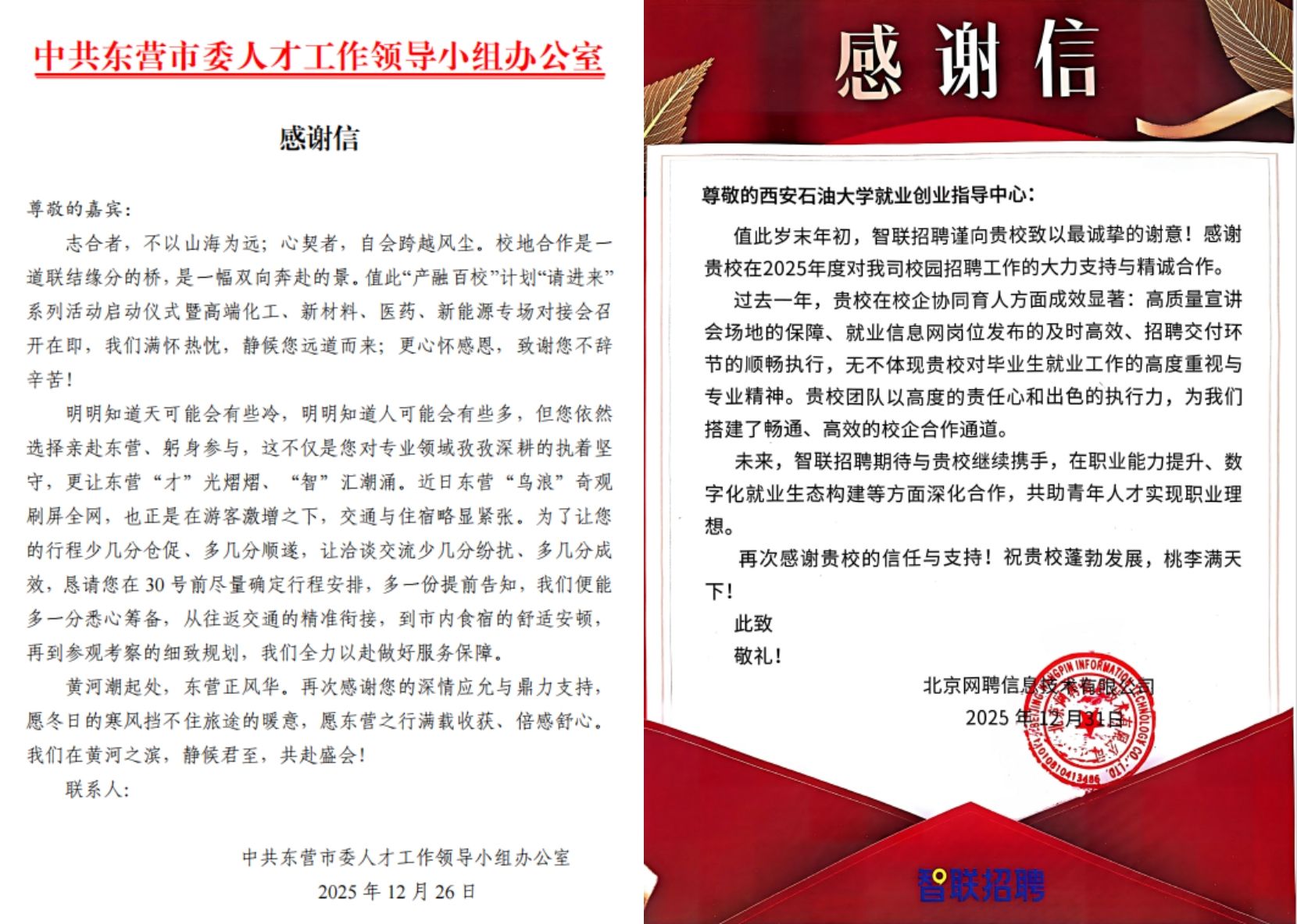 近日,我校就業(yè)創(chuàng)業(yè)指導(dǎo)中心陸續(xù)收到來自多地政府人社部門及用人單位的感謝信。字里行間飽含著對我校人才培養(yǎng)質(zhì)量的高度認(rèn)可和對學(xué)校關(guān)于就業(yè)組織、指導(dǎo)服務(wù)等工作的高度贊許,希望校地、校企攜手并進(jìn),續(xù)寫人才供需對接新篇章。
