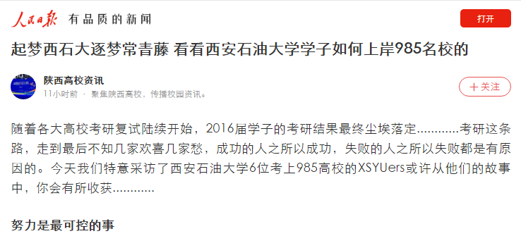 經驗總結:這次難忘的復試經歷讓我收獲了很多,也反思了很多。在我看來,能夠支撐我走到最后的優(yōu)勢是相比常人更為豐富的實踐經驗:大一到大三這幾年,在黨委宣傳部新媒體中心為官微撰寫推文的經歷讓我熟練掌握了新媒體公眾號的運營技能。得益于官微的平臺之大,我還有幸參加了陜西省省級的新媒體沙龍交流會,進一步學習到了高校自媒體的運營策略,這也直接助推了我的b站影視頻道“-Funtime-”的誕生,讓我對媒體的運營有了更加深切的體驗。另外,大三下半學期我開始了在“騰訊大秦網”為期兩個月的實習,為“吃貨在西安”、“西安種草機”撰寫美食、旅游類稿件。這所有的經歷都讓我對新聞學的實踐更加得心應手,同時也產生了更加深度的熱愛。