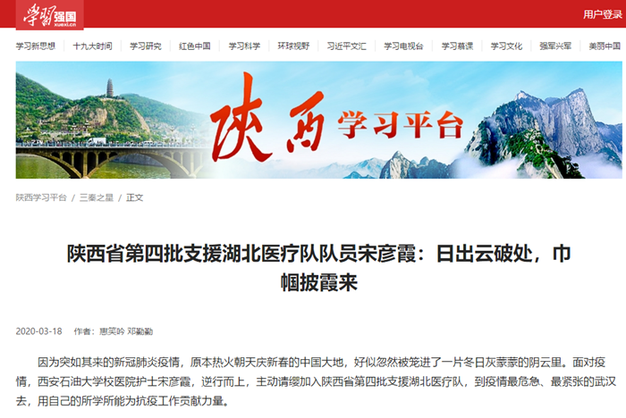 因?yàn)橥蝗缙鋪淼男鹿诜窝滓咔椋緹峄鸪鞈c新春的中國大地,好似忽然被攏進(jìn)了一片冬日灰蒙蒙的陰云里。面對(duì)疫情,西安石油大學(xué)校醫(yī)院的宋彥霞護(hù)士,逆行而上主動(dòng)請(qǐng)纓加入陜西省第四批援鄂醫(yī)療隊(duì),到疫情最危急、最緊張的武漢去,用自己的所學(xué)所能為抗疫工作貢獻(xiàn)力量。