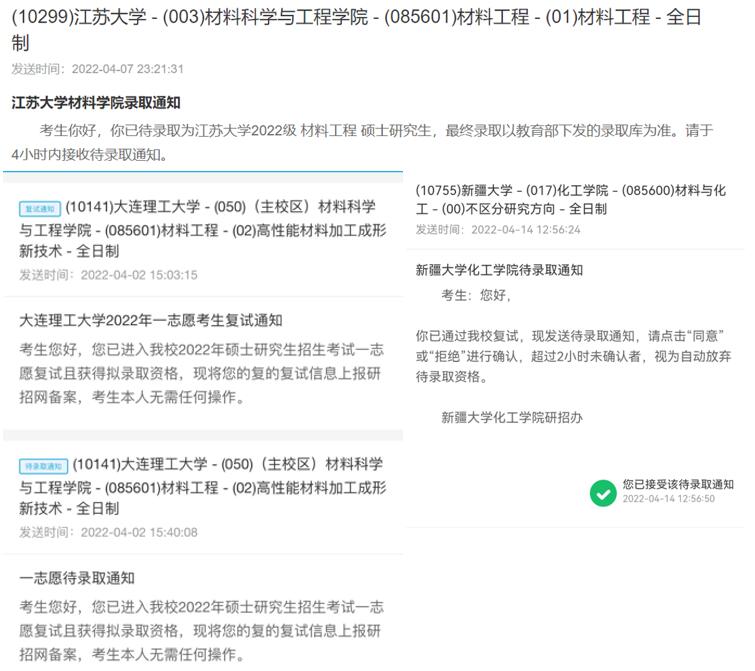 披星戴月走過的路終會以繁花以答。終于在四月初,王園媛成功調(diào)劑到江蘇大學(xué),楊思琦成功調(diào)劑到新疆大學(xué)。至此,535終于全員上岸。雖然一路艱險,一路波折,但是最終的結(jié)果沒有辜負(fù)她們的努力。