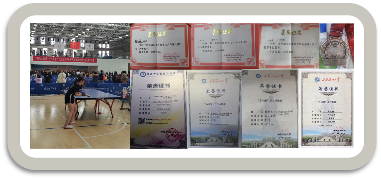 (3)體育競賽方面:黃凡薇等同學(xué)連續(xù)兩年榮獲陜西省乒乓球錦標賽女子團體第五名,黃凡薇和楊成斌等同學(xué)分別榮獲石油杯乒乓球聯(lián)賽(女子團體賽和男子團體賽)第二名和第三名,黃凡薇和楊成斌分別榮獲陽光體育節(jié)女子和男子乒乓單打冠軍和亞軍。郭志強等同學(xué)在校級“石油杯”足球賽和“足協(xié)杯”足球賽中均榮獲季軍。尤婉清等同學(xué)榮獲女子籃球聯(lián)賽第三名,張藝茹同學(xué)在羽毛球比賽上獲得季軍。